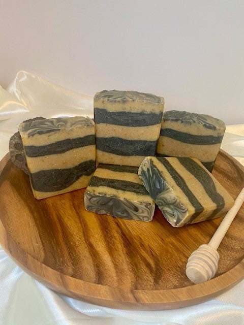 Ingredients: Beef tallow, goat milk, olive oil, coconut oil, lye, grapeseed oil, cocoa butter, shea butter, castor oil, turmeric, activated charcoal, bentonite clay, honey, carrot seed oil, myrrh oil, frankincense oil, and lemon oil