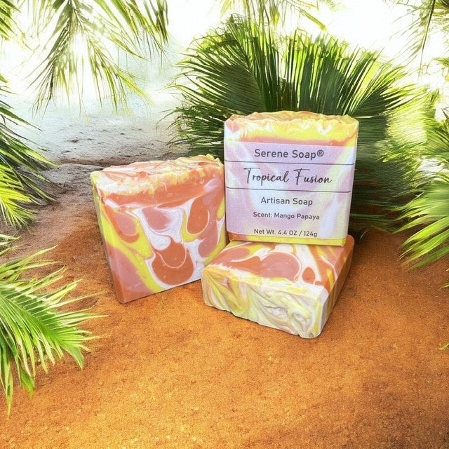 Escape to a sun-drenched paradise with every wash. Our Tropical Fusion artisan soap is a lush blend of juicy mango and ripe papaya—a scent that instantly transports you to island breezes and golden sunsets.